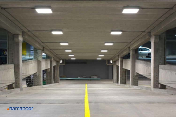 - انتخاب نوع چراغ: بسته به نوع پارکینگ (سرپوشیده یا روباز) باید بین مدلهای LED، سنسوردار یا ضدآب انتخاب شود.